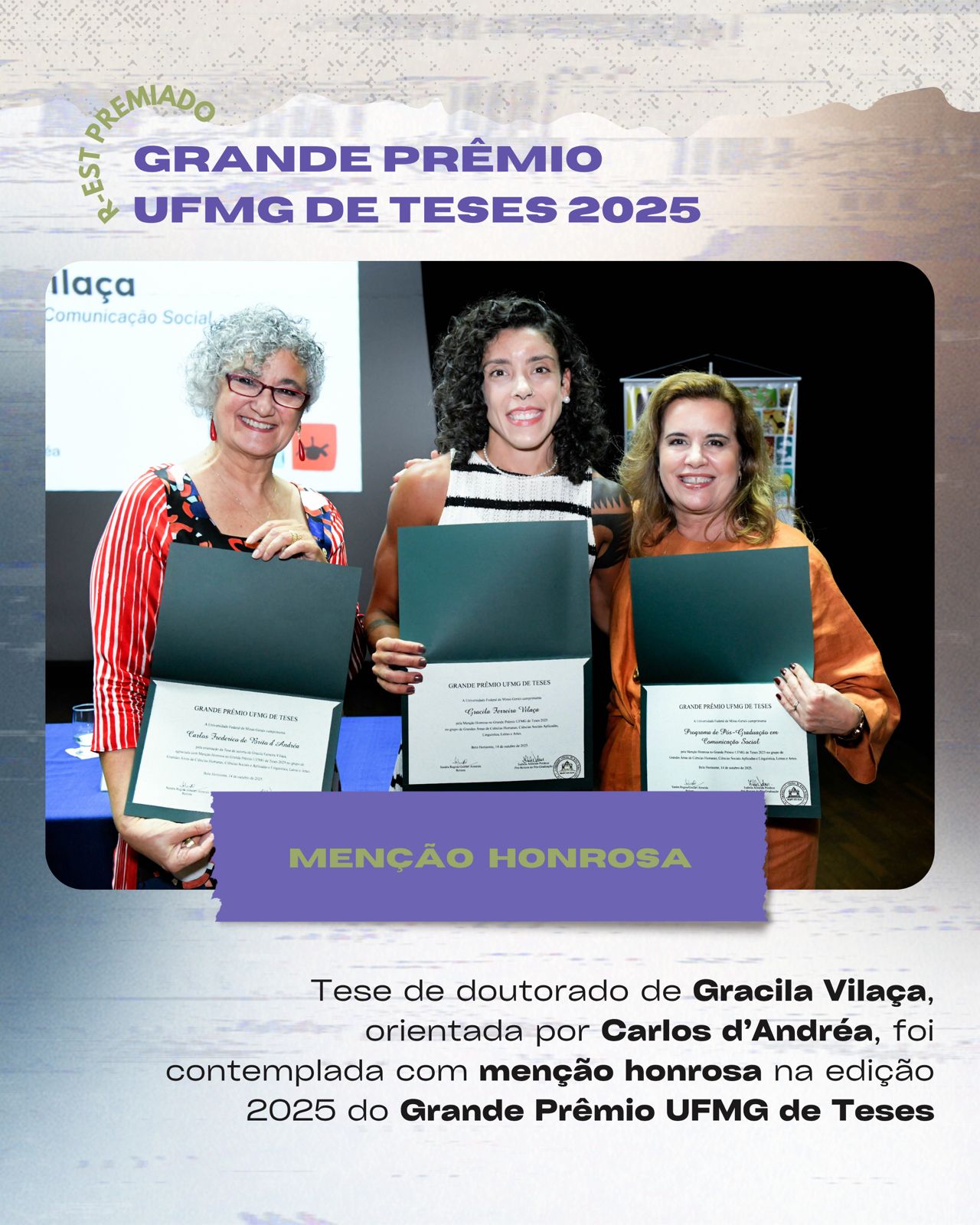 A tese de doutorado da nossa pesquisadora Gracila Vilaça, orientada pelo professor Carlos d’Andréa no PPGCOM, recebeu menção honrosa no Grande Prêmio UFMG de Teses 2025, na grande área de Ciências Humanas, Ciências Sociais Aplicadas, Linguística, Letras e Artes.